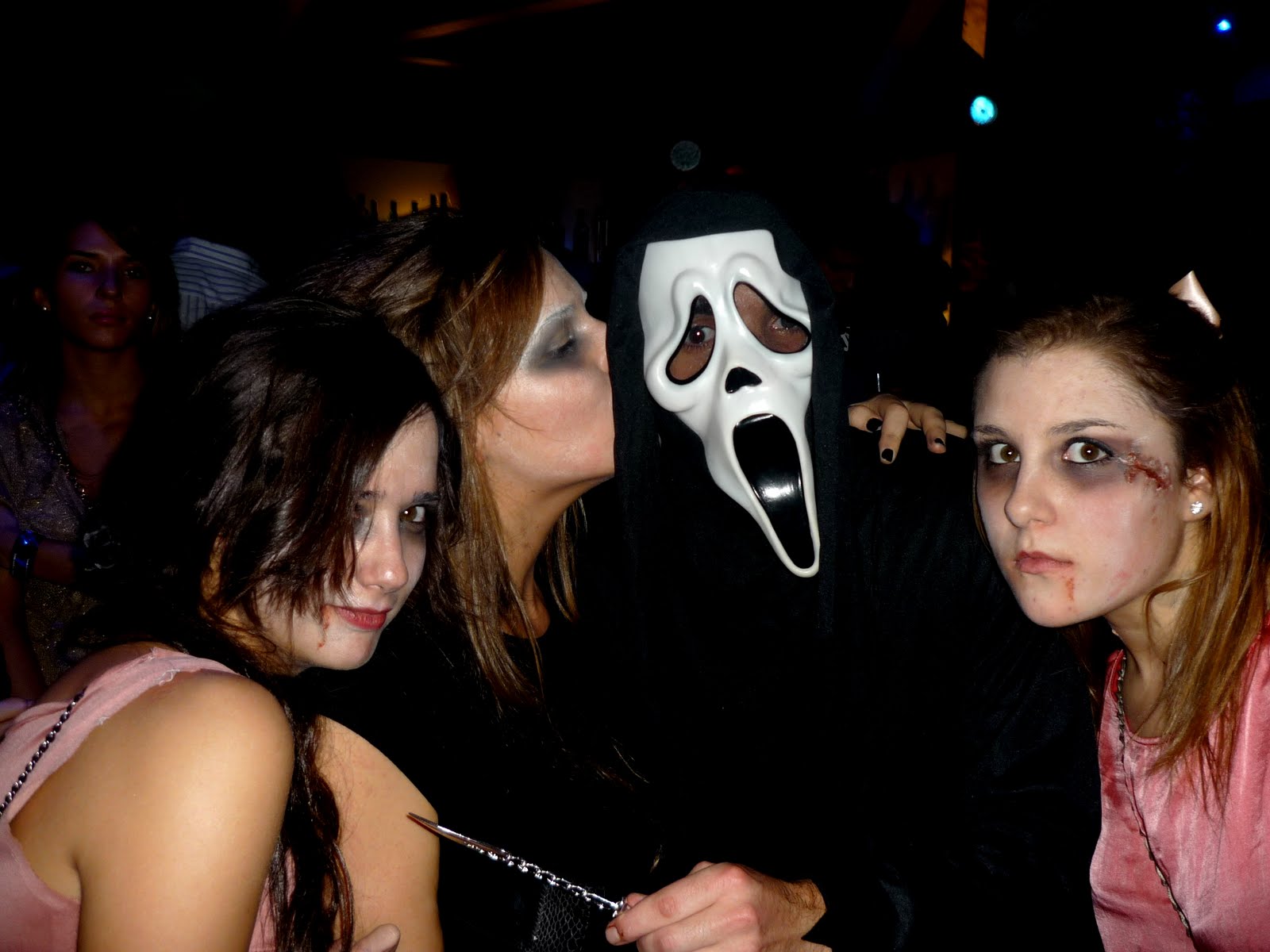 El domingo 31 si que nos disfrazamos mis amigos y yo de un tema mas o menos acorde. Todos íbamos de vampiros, con los colmillos clavados y llenos de cicatrices. Me pude mi lazo y mi vestido de niña antigua recién mordida y ala! a la calle.