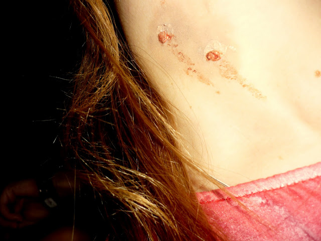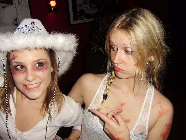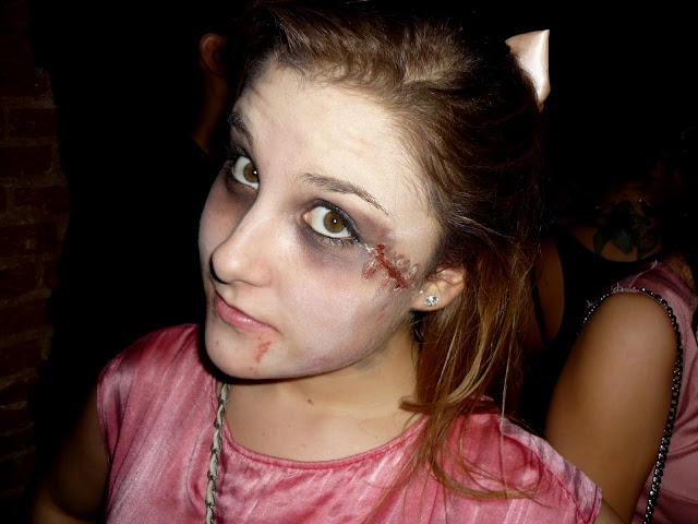 On Sunday, 31 my friends and I dress up with a more or less consistent subject. We were all vampires, with their fangs, and scars. I wore my pink loopand my old girl dress, just biten!